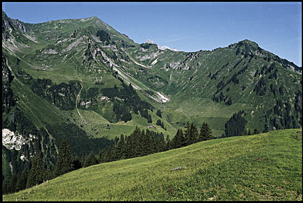 Vom Mittelberg nach W die steilen Alpmulden von Raufli und Nessli, dazwischen überragend das Rauflihore (von der andern Seite Blutlighore).